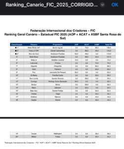Curiosamente, muitos dos pássaros que brilham no estadual também aparecem entre os melhores do Campeonato Nacional FIC, confirmando o alto nível técnico dos competidores.