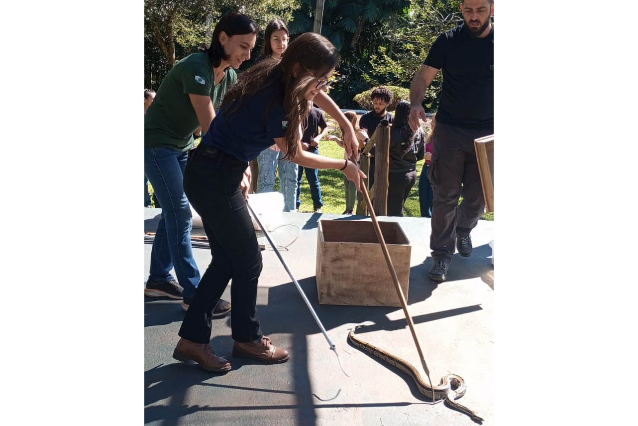 “Como temos muitas aparições de serpentes no parque, fizemos essa parceria com o biólogo, que possui a licença para lidar com répteis, para promover esse curso. O objetivo é explicar aos técnicos o manejo correto, que garanta a segurança do servidor e também para que a cobra possa ser devolvida à natureza em um local apropriado”, explica a gerente do Lago Azul, Polyana Silva Pereira.